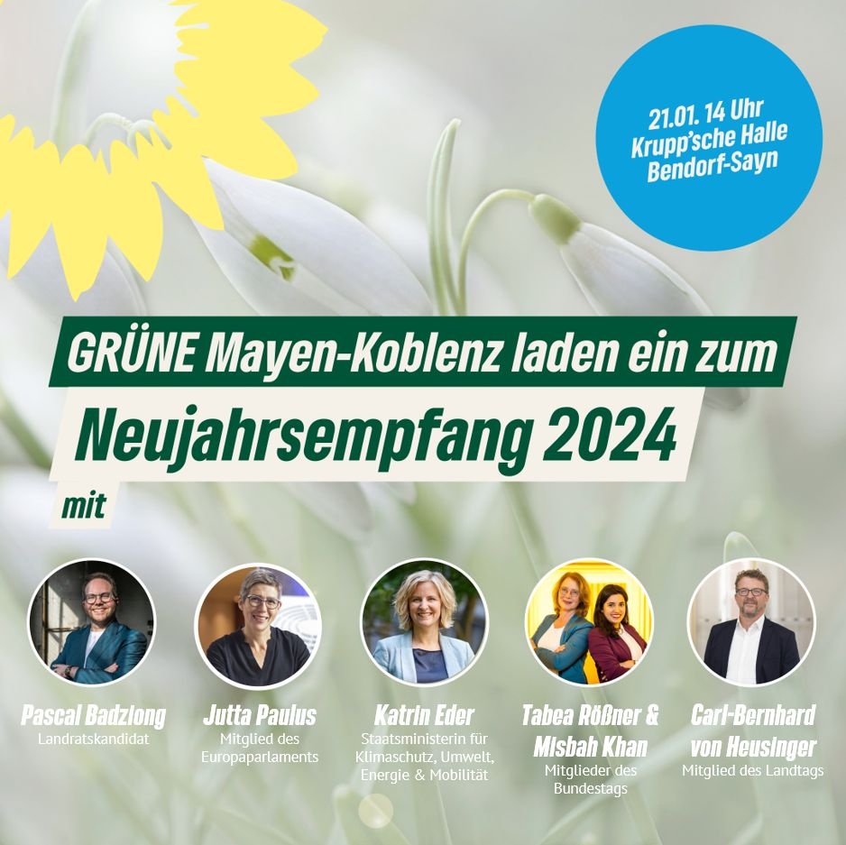 Jetzt noch schnell anmelden für unseren Neujahrsempfang! Am Sonntag starten wir das politische Jahr in Mayen-Koblenz. Den Zugangslink erhaltet ihr über: info@gruene-myk.de
