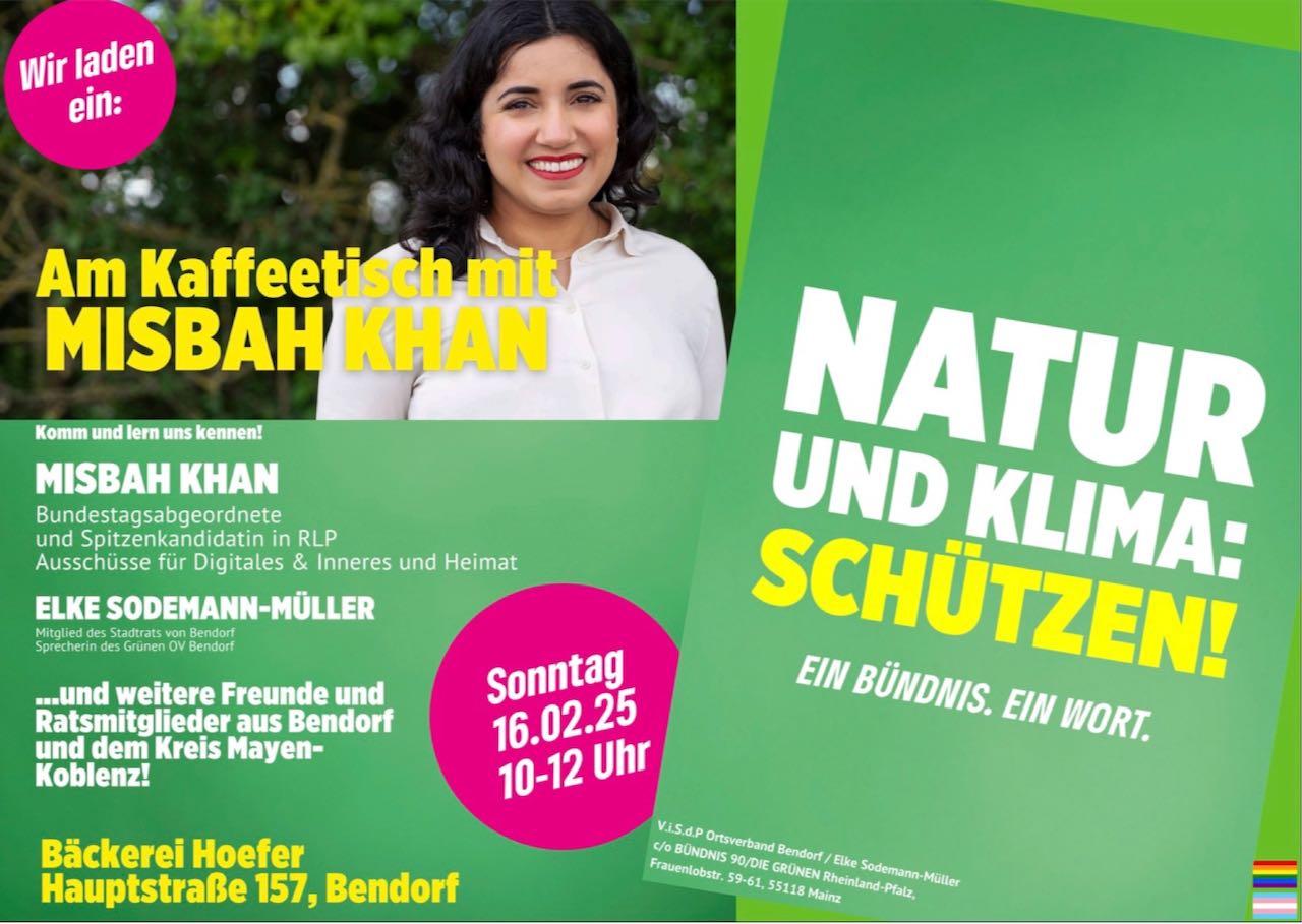 Die Bendorfer Grünen laden zum Gespräch mit der rheinland-pfälzischen Bundestagsabgeordneten und aktuellen Spitzenkandidatin: mal mit einer grünen Spitzenpolitikerin in direkten Kontakt treten, die eigenen Sorgen und Vorschläge auf die Berliner Ebene transportieren – dazu ist am kommenden Sonntag Gelegenheit. Im Warmen, bei einer Tasse Kaffee und ein paar Häppchen werden Ihre/ Eure Ideen und Vorschläge gerne aufgenommen. Herzliche Einladung in die Bäckerei Höfer in Bendorf, Hauptstraße 157, wo Misbah Khan am Sonntag, den 16. Februar von 10:00-12:00 Uhr für Gespräche zur Verfügung stehen wird.