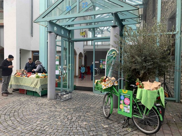 Schon um 8:00 Uhr kam Bewegung in die Passage und ihre Umgebung. Von verschiedenen Seiten wurde das Goethe-Atrium/ Em Flegge angefahren – per PkW, Lieferwagen oder Fahrrad. Fleißige Hände luden die verschiedensten Dinge aus: Kartoffeln, viele Sorten Gemüse, Obst, Fleischkonserven, diverse Mehle, alles aus der Region und größtenteils in Bio-Qualität. Vor, hinter und in der Passage wurden nach und nach die Stände aufgebaut und nach knapp zwei Stunden bot sich dem Betrachter ein buntes und leider bisher ungewohntes Bild: die Passage war zu neuem Leben erwacht.