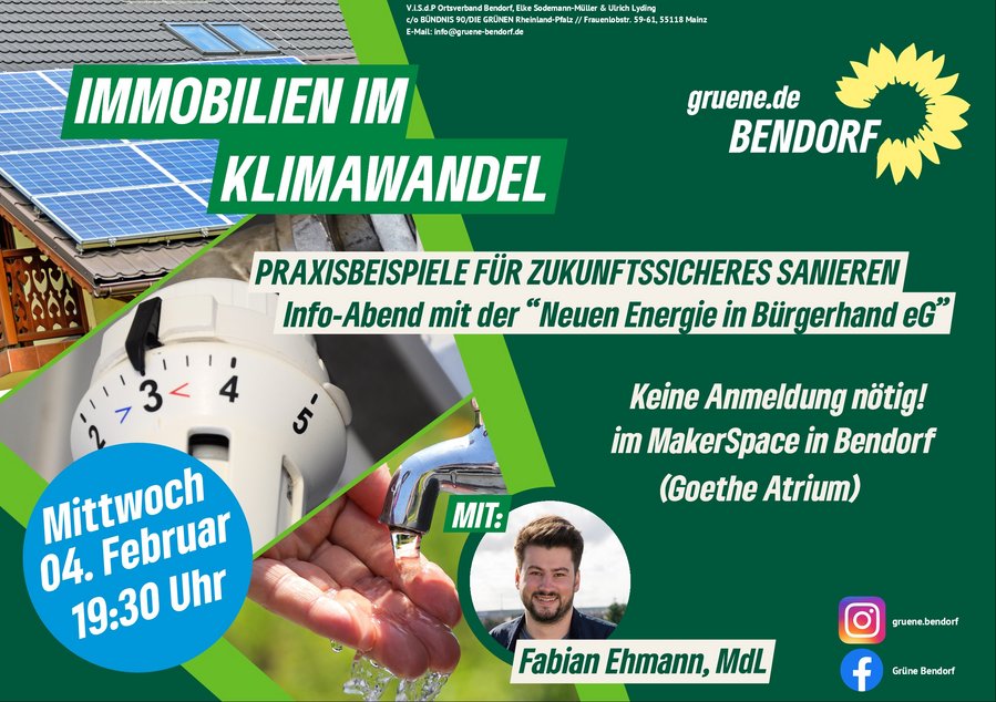 Anhand von konkreten Beispielen und zusammen mit Fachleuten wollen die Bendorfer Grünen Lösungen für diese drängenden Fragen suchen. Hierzu wird es Informationen von der „Neuen Energie in Bürgerhand“, einer Bendorfer Bürger-Energiegenossenschaft geben, die es sich zur Aufgabe gemacht hat, das Thema Energie stärker in die Hände der Bürger zu legen. Jan Geisen wird sein erfolgreiches Haus-Sanierungs-Projekt vorstellen. Und unser grüner Landtagsabgeordneter Fabian Ehmann kann als Fachpolitiker zu den politischen Rahmenbedingungen dieser Projekte informieren.